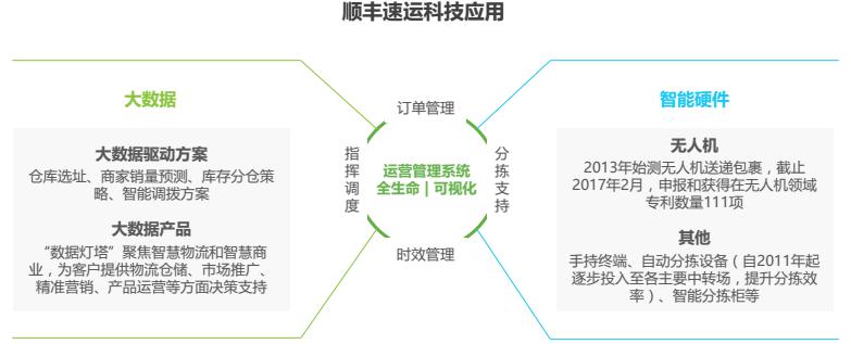 顺丰速运成立于1993年,截止2016年12月,顺丰控股业务覆盖全国331个地级市、2620个县区级城市,近13000个自营网点。顺丰速运业务包括国际业务、同城配送、冷运、重货(陆路&航运)等。顺丰一贯重视在信息化领域的投入,负责集团信息系统研发与运维的科技人员超过2,000名,16年信息技术费投入2.6亿、占营业成本0.57%,相较15年提升0.08个百分点。14-16年来,顺丰控股申报和获得的专利523项,软件著作权200多项。未来,顺丰还将继续扩大在科技领域投入,不断提高各方面的科技与智能化水平。