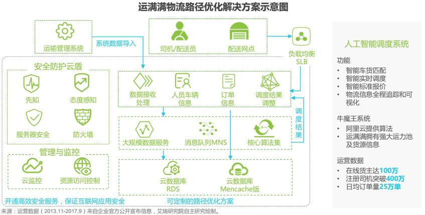 2016年底,运满满携手阿里云,发布了“牛魔王”人工智能调度系统,结合运满满的数据和用户场景、以及阿里云的算法团队,共同推动干线配货人工调度朝着智能化方向推进。“牛魔王”系统是基于云计算、大数据、移动互联网和人工智能技术的公路物流领域高新技术综合应用的典型代表,可以实现服务车主与货主的智能车货匹配、智能实时调度、智能标准报价及对物流信息全程追踪和可视化,显著提升公路干线物流货源、车辆、路线、价格匹配速度、精准度和运输组织效率。