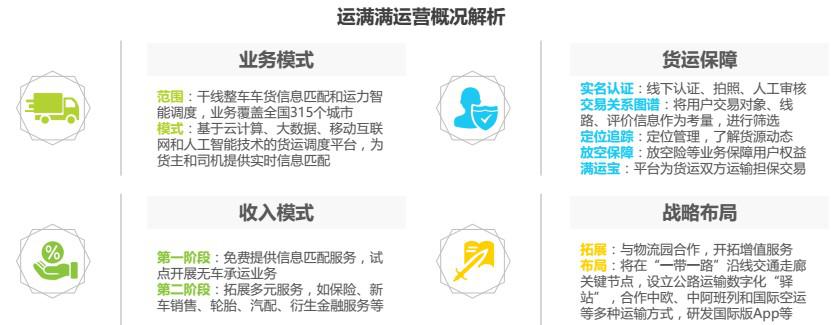 运满满成立于2013年,是基于云计算、大数据、移动互联网和人工智能技术开发的货运调度平台,为货主和司机提供实时信息匹配,减少货运空载率、提高物流运行效率。由于模式相近,运满满被业界称为“货运版的滴滴”,成立3年来共获得7轮融资,目前估值超过10亿美金。截止2017年9月底,平台实名注册重卡司机400余万、货主100余万,业务覆盖全国 315 个城市。运满满最新推出担保交易产品“满运宝”,为货运双方提供运费担保。此外,运满满还与阿里云、菜鸟、蚂蚁金服、平安保险、中国联通、中国重汽等开展深度战略合作,通过跨界融合,不断推出创新产品和服务。未来,运满满将借助人工智能、无人驾驶、区块链等技术驱动,提供贯穿全产业链的线上线下服务,构建公路物流生态圈,打造综合性的货运平台。