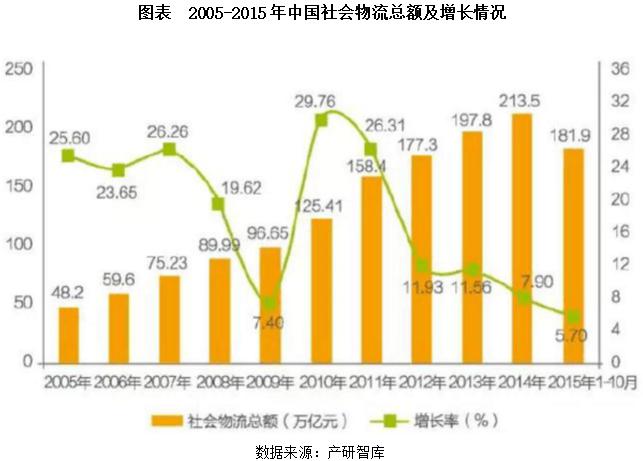 2015年1-10月,全国社会物流总额为181.9万亿元,按可比价格计算,同比增长5.7%,增速较1-9月回落0.1个百分点,增速比去年同期回落2.6个百分点。