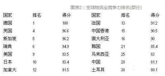 国家的物流业总体竞争力不仅取决于基础设施建设水平,还取决于整个物流产业的管理水平、第三方物流企业发展水平和第四方物流企业的整合能力。从国家层面来看,世界银行发布的报告显示,在全球物流业竞争力排行榜(Logistics Performance Index)中,欧洲国家表现最为突出,前20名中超过60%的企业来自欧洲,亚洲物流业竞争力最强的国家/地区是日本(排名第十),其次为中国香港和台湾地区,中国大陆在全球仅排名第28。总体而言,发展中国家在基础设施、国际运输、物流能力、交货及时性等方面还与欧美等发达国家存在较大的差距,物流业的全球竞争能力还十分有限。