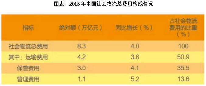 2015年1-10月,社会物流总费用规模为8.3万亿元,同比增长4.0%,增速比1-9月回落0.1个百分点。从结构看,运输费用4.2万亿,同比增长3.6%,占社会物流总费用的比重为50.9%;保管费用3.0万亿,同比增长4.1%,占社会物流总费用的比重为35.5%;管理费用1.1万亿,同比增长5.2%,占社会物流总费用的比重为13.6%。
