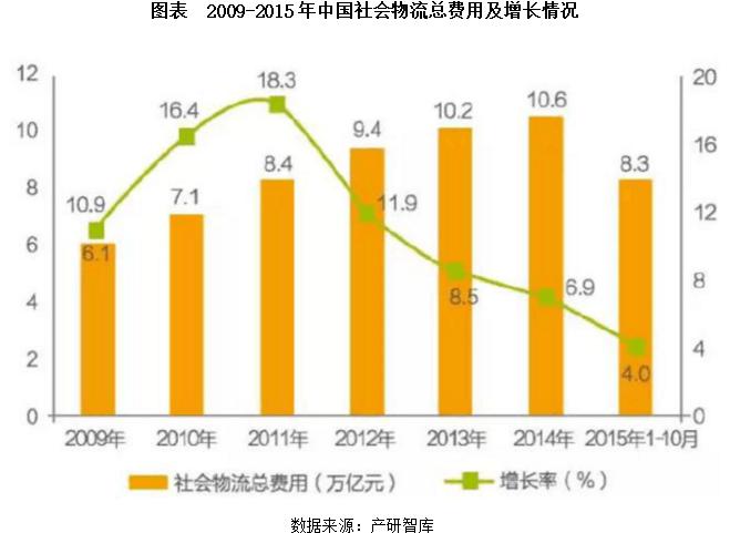 2014年社会物流总费用10.6万亿元,同比增长6.9%。社会物流总费用与GDP的比率为16.6%,比上年下降0.3个百分点。其中,运输费用5.6万亿元,同比增长6.6%,占社会物流总费用的比重为52.9%;保管费用3.7万亿元,同比增长7.0%,占社会物流总费用的比重为34.9%;管理费用1.3万亿元,同比增长7.9%,占社会物流总费用的比重为12.2%。