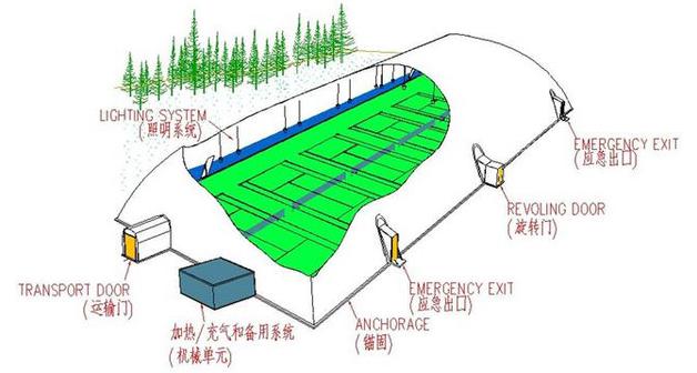 气膜体育馆内除了需要配备一套智能化的加热、充气以及备用设备之外,还需要具备完整的照明系统以及门禁系统。其中的运输门主要供相关的工作人员使用,最主要的作用是运输体育场馆内所需要的大型物件;旋转门则是为运动人员以及工作人员日常进出提供方便。为了防止发生意外事故,一般在气膜体育馆内还会专门开设几个应急出口。