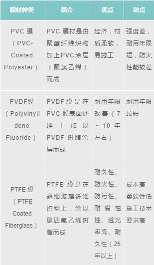 用于建筑膜结构的膜材,依涂层材不同大致可分为PVC 膜、PVDF膜和PTEF 膜,膜材的正确选定应考虑其建筑的规模大小、用途、形式,使用年限及预算等综合因素后决定。