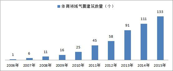 目前,世界上已经建成有上万个气膜建筑了,2011年以后中国气膜场地的数量迎来集中爆发期,全国每年新增项目数量基本稳定在30个以上。截至2015年末,我国气膜建筑总项目数达到215个,建筑面积达到88.76万平方米;其中,现存的项目数量和建筑面积分别为197个和78.60万平方米,现存率在90%左右。气膜建筑可以应用的范围非常广阔,但是我国目前还是作为运动场馆的比较多,市场接受度也比较高。随着社会对环保的关注,企业经营过程中环保的成本要求越来越高,未来在工业领域,气膜建筑还有更广泛的应用。