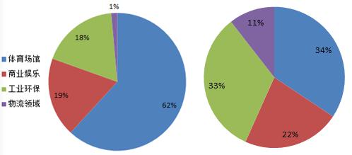 图表4 气膜建筑项目数量(左)、建筑面积(右)各应用领域占比