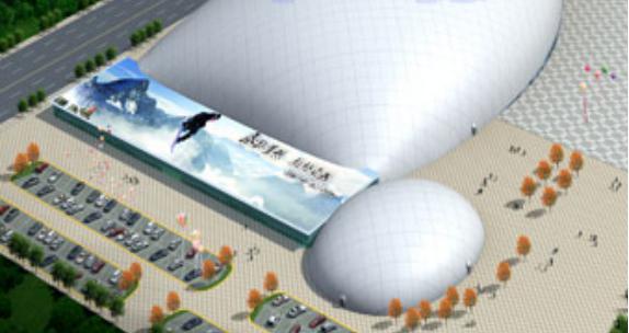 本项目为国内首座气膜室内滑雪场建筑,项目总建筑面积2.5万多平米,其中滑雪区1.6万平米,戏雪区7500平米,冰雕区1500平米等。气膜建筑面积2.5万平米,跨度50~120米不等,高度15-30米之间。应用了独创超低温隔热专利技术、超低温隔热专利技术、超低温通道技术、大跨度气膜技术、JRT钢索网技术等等,可抵御16级超级台风。其中,超低温隔热专利技术,导热系数低至0.03W/M2·K 左右,达到冷藏库隔热水平。