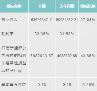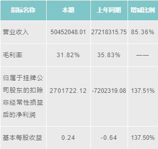维拓环境2016年营业收入为50452048.01元,增长85.36%;毛利润为31.82%;归属于挂牌公司股东的扣除非经常性损益后的净利润为2701722.12元,增长137.51%;基本每股收益为0.24元,增长137.50%。
