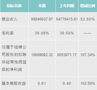 博德维2016年营业收入为98846037.97元,增长52.60%;毛利润为39.08%;归属于挂牌公司股东的扣除非经常性损益后的净利润为16699082.32元,增长107.34%;基本每股收益为0.81元/股,增长102.50%。