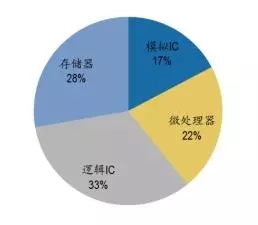从进口集成电路产品的类别来看,微处理器/控制器进口额位列榜首,2014年价值高达1052.2亿美元,占比48.33%;接着是半导体存储器,2014年价值达542.8亿美元,占比24.93%,之后是放大器,占比4.13%。