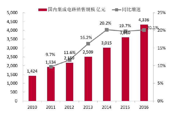 2016年中国集成电路产业继续高速增长的势头,从半导体行业协会的2017年最新统计,2016年中国集成电路产业销售额高达4335.5亿元,比2015年增长20.1%。