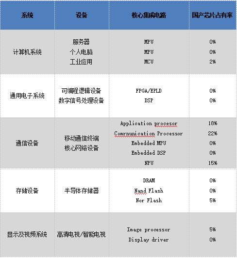 表中计算机系统中的MPU、通用电子系统中的FPGA/EPLD和DSP、通信装备中的 Embedded mpu和DSP、存储设备中的DRAM和 Nand flash、显示及视频系统中的 Display driver,国产芯片占有率都是零这就指出了一个严峻的问题,我国所需核心芯片主要依赖进口。半导体产业关系国家经济和安全命脉,中国半导体从业者身肩重责,必须为核心芯片国产化不断努力。