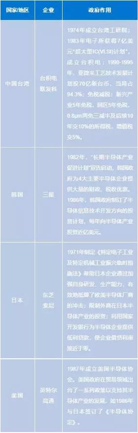 根据中国台湾、韩国等国家/地区半导体产业发展的经验,政府的扶持具有不可替代的作用。台湾地区1974年成立台湾工研院,1987年成立台积电,并在其上投入了8年后,才实现盈亏平衡,走上独立的发展的道路;韩国政府通过为国内半导体企业提供大量的财政、税收优惠来支持本国半导体产业的发展。因此,政府的持续投入是IC制造和发展的必要条件。
