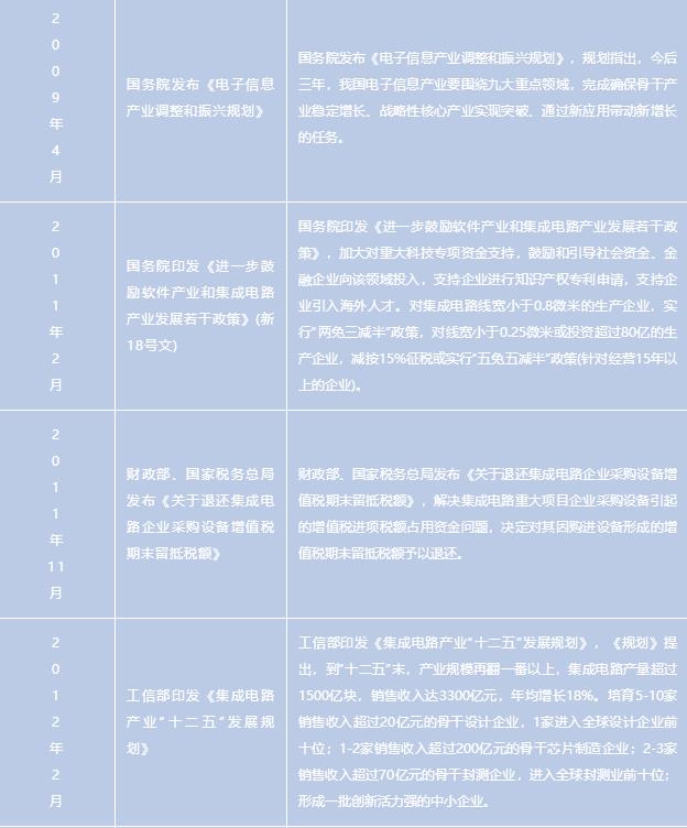 2011年出台的《国务院关于印发进一步鼓励软件产业和集成电路产业发展若干政策的通知》,提出要大力支持软件和集成电路重大关键技术的研发,努力实现关键技术的整体突破,加快具有自主知识产权技术的产业化和推广应用,重点支持高端芯片、集成电路装备和工艺技术、集成电路关键材料、关键应用系统的研发以及重要技术标准的制订;在《电子信息制造业“十二五”发展规划》和《集成电路产业“十二五”发展规划》中也均提出要着力发展芯片设计业,壮大芯片制造业,开发髙性能集成电路产品,增强先进和特色工艺能力。