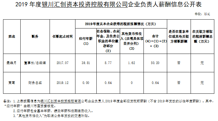 银川汇创资本投资控股有限公司企业负责人2019年度薪酬情况