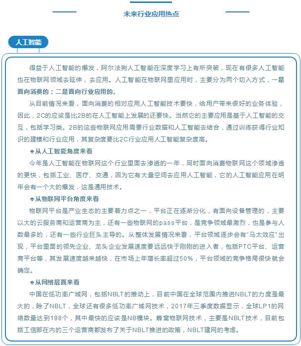 2017年行业发展的突出领域集中在新零售、共享经济和智能家居三个行业。物联网技术贯穿在新零售整个发展过程中,包括从入门的识别、对物体采购时的移动、最后的结账以及人脸识别都是物联网技术和新零售的结合,从线上走向线下,来解决它的技术性问题;