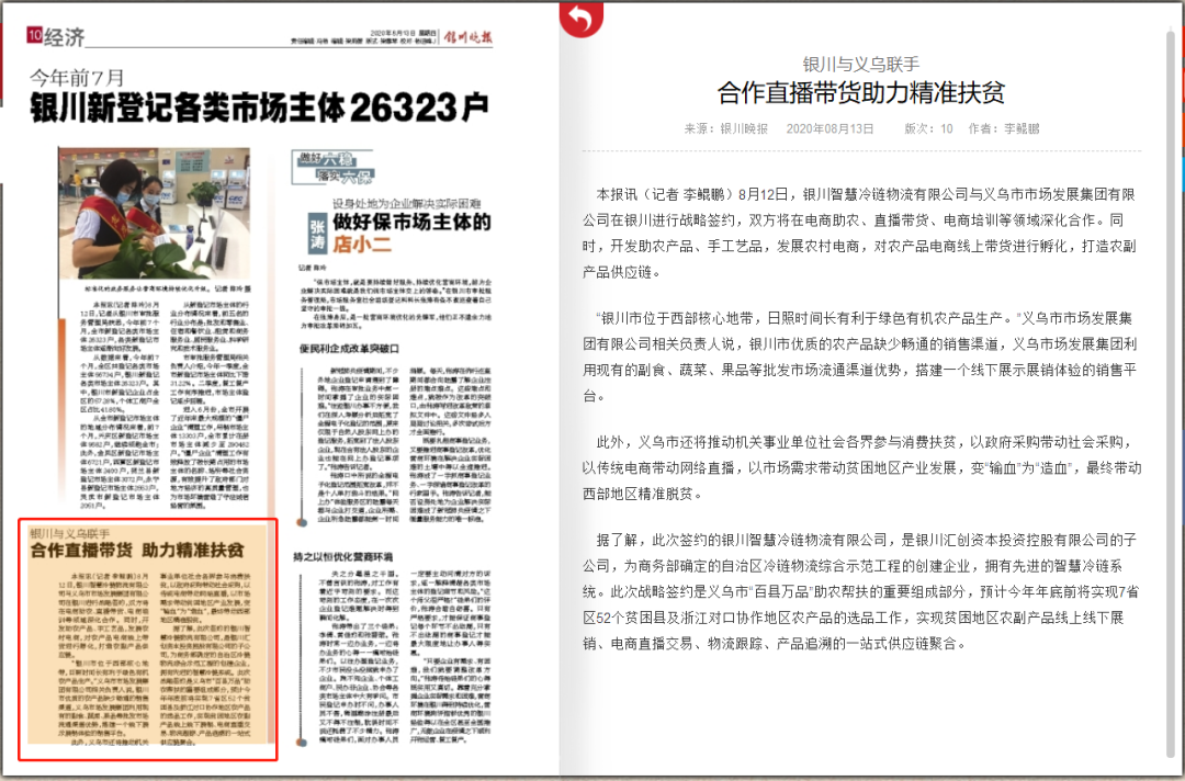 银川智慧冷链物流有限公司作为汇创资本的子公司,主要从事生鲜食品的采购、储存、分拣、加工和配送等业务,一直以来致力于通过“安全采购+网络平台+冷链配送+线下实体+线上服务”的全产业链服务模式,打造设施先进、上下游衔接、功能完善、标准健全的农产品冷链物流服务体系。此次战略签约是义乌市“百县万品”助农帮扶的重要组成部分,更是银川智慧冷链物流有限公司进军直播市场助农帮扶、推进农产品供应链体系建设、提升农副产品服务水平的重要举措,双方的合作对助力打赢脱贫攻坚战,实现短期扶贫成效与中长期产业升级的均衡发展具有重要意义,受到了媒体的争相报道和社会各界的广泛关注,宁夏广播电视台、宁夏新闻网、银川日报、银川晚报等区内主要媒体对签约仪式进行了报道,搜狐网、新浪网等媒体第一时间进行了转载,银川市人民政府等单位官方网站也对相关情况进行了广泛宣传和推广。
