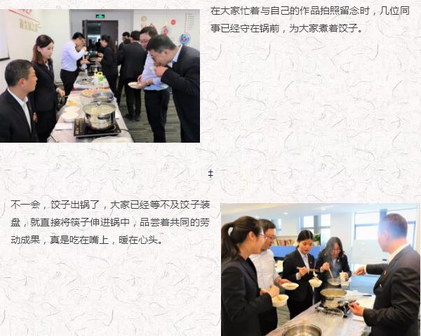 冬至到,寒风凉,盛碗饺子暖洋洋。12月22日上午,汇创资本组织了主题为“乐享冬至 温暖如初”的“迎冬至 包饺子”活动,让广大员工一同感受节日的气氛,在发扬传统文化,继承传统习俗的同时,为整个寒冷的冬日注入了融融暖意。